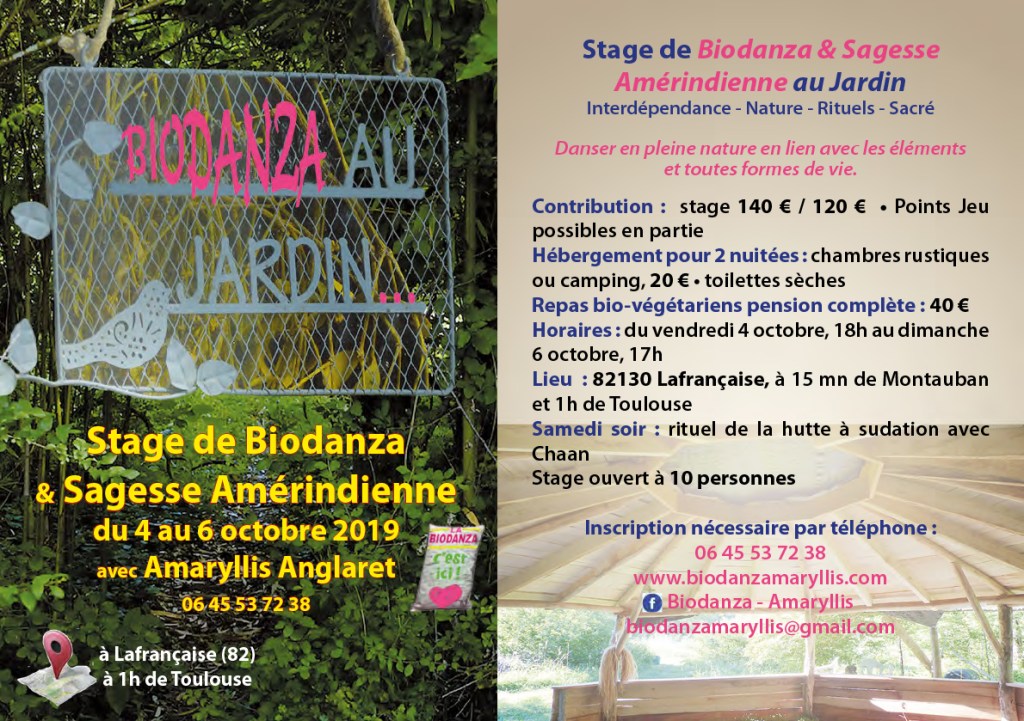 - Arrhes : 50 € par chèque à Asso Amaryllis ou en ligne ici : https://www.helloasso.com/associations/association-amaryllis/evenements/stage-de-biodanza-et-sagesse-amerindienne-1